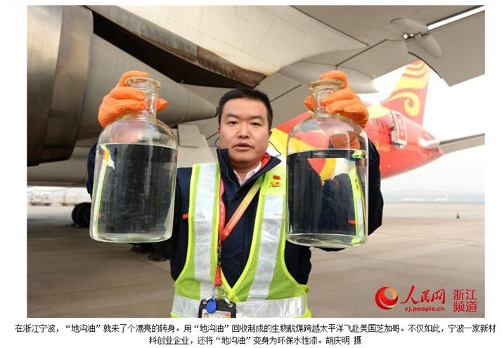 人民网宁波11月30日电 脏兮兮的地沟油能变废为宝吗?在浙江宁波,“地沟油”就来了个漂亮的转身。近日,航班号为HU497的海航787客机从北京起飞,使用“地沟油”回收制成的生物航煤跨越太平洋飞赴美国芝加哥。不仅如此,宁波一家大学生创业企业,还将“地沟油”变身为环保水性漆。
